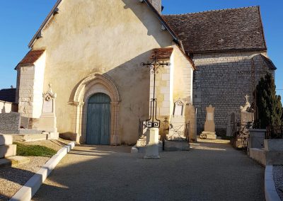 Juste à côté se dresse l’église datée des 12è et 16è siècles. Elle était une succursale de St Lyé. Au fil des siècles, de nombreux pèlerins ou gens de passage y ont laissé la marque de leur présence en gravant de nombreux graffiti sur les murs extérieurs. L’intérieur sobre est de style gothique. On peut y voir (monuments classés) une  »Vierge de Pitié et à l’Enfant » et des vitraux du 16è siècle – (voir le détail des vitraux – photos de M. Denis Krieger).